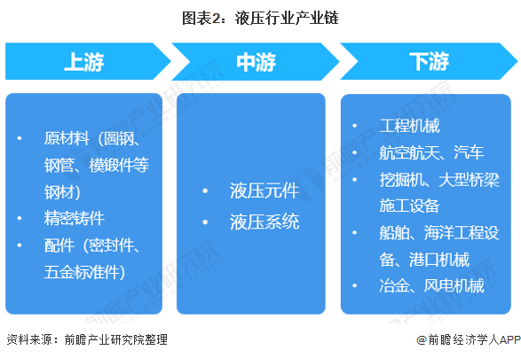 我国液压行业产业链上游为圆钢、钢材等原材料、精密铸件和相关配件,中游为液压元件和液压系统等制造企业,下游应用领域较为广泛,包括工程机械、航空航天、挖掘机、大型桥梁施工设备船舶、海洋工程设备、港口机械治金、风电机械等领域。