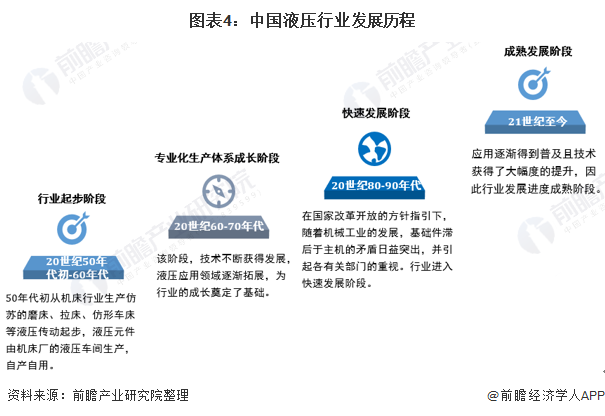20世纪50年代,我国液压行业进入起步阶段。20世纪60年代后,我国液压技术的应用从机床逐渐推广到农业机械和工程机械等领域,原来附属于主机厂的液压车间有的独立出来,成为液压件专业生产厂,行业进入专业化生产体系成长阶段。进入20世纪80年代,在国家改革开放的方针指引下,液压行业在规划、投资、引进技术和科研开发等方面得到基础件局的指导和支持,从此进入了快速发展期。21世纪以来,国家积极出台政策促进行业的发展,也加大了技术改造力度,行业进入成熟发展阶段。