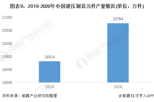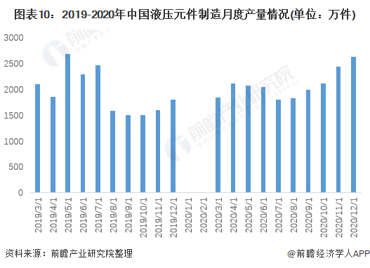 通过WIND对液压元件和气动元件的产品产量数据进行统计结果显示,2019-2020年我国液压制造元件产量呈不断上升趋势,2020年我国液压制造元件产量为20764件,同比上升8%。根据月度产量可知,2020年下半年液压元件产量成大幅度上升趋势,原因是2020年下半年在疫情得到有效控制后,下游机械、汽车、工程行业开始恢复正产生产,需求量得到释放,因此产量大幅度上升。