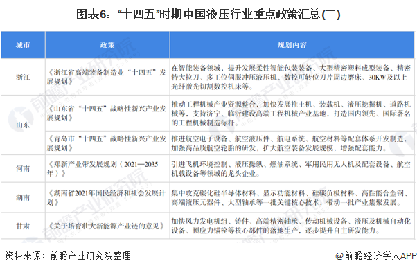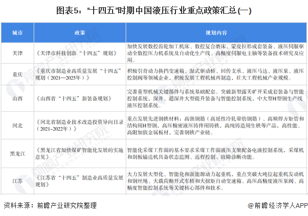近年来,随着液压行业应用领域的逐步拓宽,我国住建部、国务院、工信部、发改委都出台相关政策推动并规范液压行业的发展。目前,我国国产液压元件多为基础性元件,技术含量较低,高端元件多依赖进口。在“十四五”纲要“智能制造”的引导下,我国主要省市均出台政策推动液压行业走向智能化、高端化,提升我国液压行业的自主研发能力,不断攻关液压件的核心技术,实现产业独立自主生产。