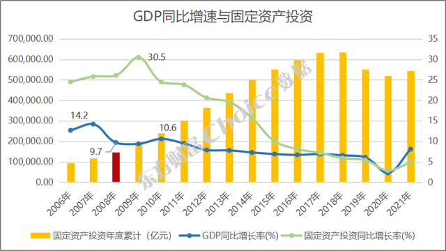 2008年,美国的金融危机扩散,我国进出口值降为负值,GDP增速由2007年的14.2%罕见下降4.5%来到9.7%,为了应对经济危机2008 年11月我国迅速推出了一项为期两年,总额达四万亿元的刺激措施。