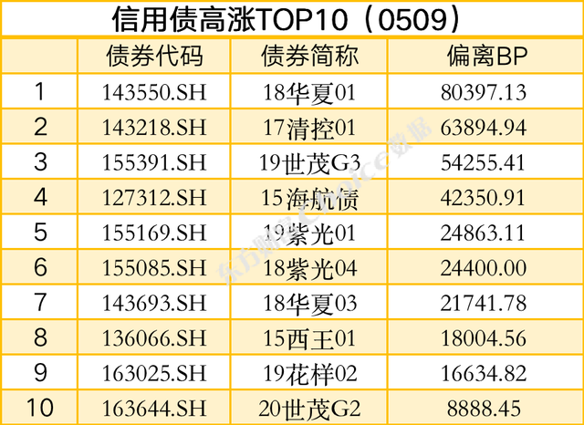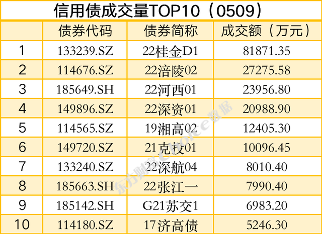 信用债方面,截至5月9日17:00,交易所成交量前三的债券为:22桂金D1、22涪陵02、22河西01;交易所涨幅前三的债券为:18华夏01、17清控01、19世茂G3。