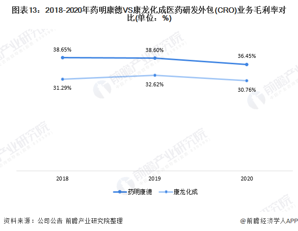 从医药研发外包(CRO)业务毛利率水平来看,药明康德毛利率水平较高,说明其获利能力较强;2018-2020年均在38%左右,但康龙化成与药明康德的毛利率水平差距较小,差距保持在6%左右。