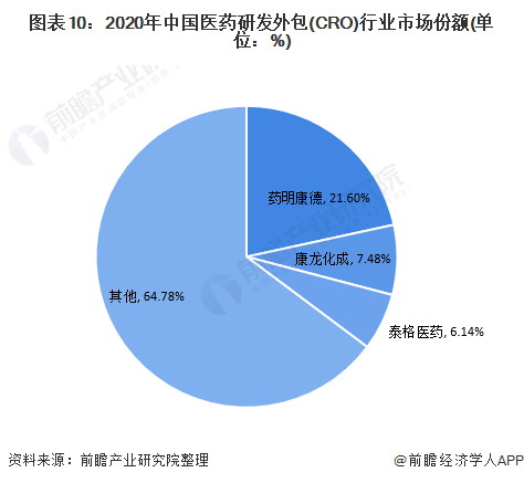 根据Frost&Sullivan的数据,2020年,我国医药研发外包(CRO)市场规模约为80亿美元。依据各公司企业年报所公布的数据对医药研发外包(CRO)行业市场份额进行测算分析,分析结果如下:2020年,药明康德的市场份额达到了21.6%;其次是康龙化成,达到了7.48%;再者是泰格医药,达到了6.14%。