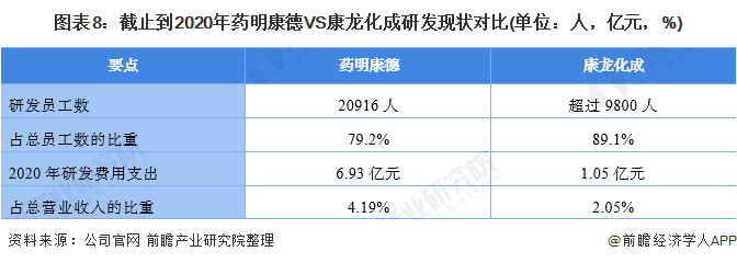 从研发人员来看,截止到2020年,药明康德的研发员工数有20916人,占总员工数的79.2%;而康龙化成截止到2020年则是超过了9800人,占总员工数的89.1%。从研发费用角度来看,药明康德的研发费用2020年达到了6.93亿元,占总营业收入的4.19%;而康龙化成2020年的研发支出达到了1.05亿元,占总营业收入的2.05%。
