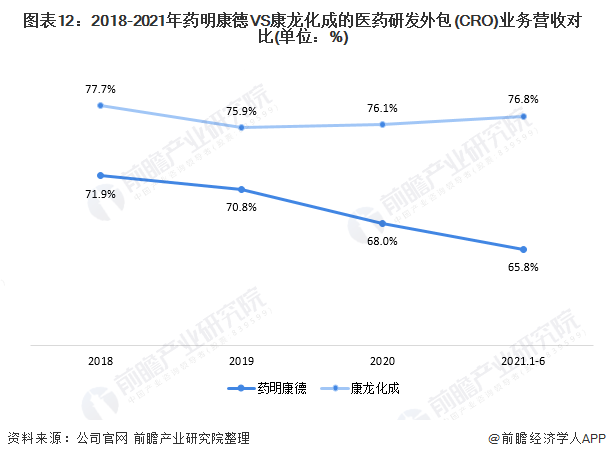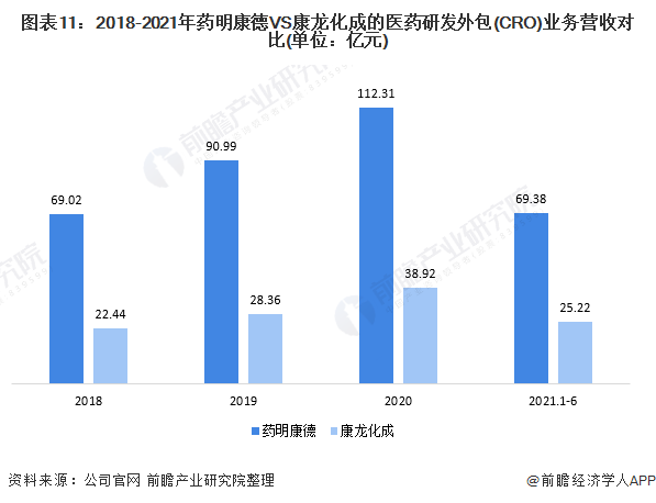从医药研发外包(CRO)业务整体营收水平上看,药明康德的医药研发外包(CRO)业务营收近年来都远远超过了康龙化成,并且呈现不断攀升态势;从2018年的69.02亿元上升至2020年的112.31亿元;2021年上半年,药明康德的医药研发外包(CRO)业务收入达到了69.38亿元。康龙化成的医药研发外包(CRO)业务收入也呈现不断攀升的态势,从2018年的22.44亿元上升至2020年的38.92亿元;2021年上半年,康龙化成的医药研发外包(CRO)业务收入达到了25.22亿元。