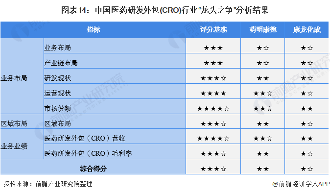 在医药研发外包(CRO)行业中,业务布局、产业链布局、研发现状等均是体现公司医药研发外包(CRO)经营规模的重要体现,因此,基于前文分析结果,前瞻认为,药明康德在营业收入、毛利率、运营现状等方面占据较大优势,在医药研发外包(CRO)行业占据领先地位。