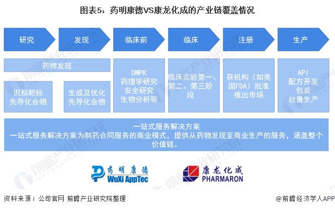 目前,药明康德和康龙化成均已完成产业链覆盖。药明康德是行业中极少数在新药研发全产业链均具备服务能力的开放式新药研发服务平台;而康龙化成是提供药物研究、开发与生产及临床CRO+CDMO全流程一体化服务。