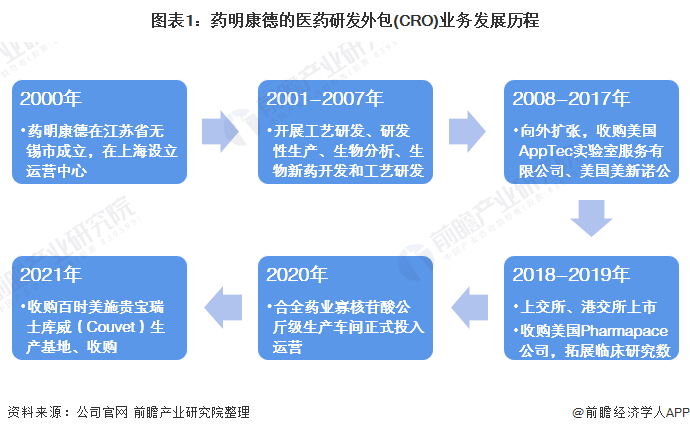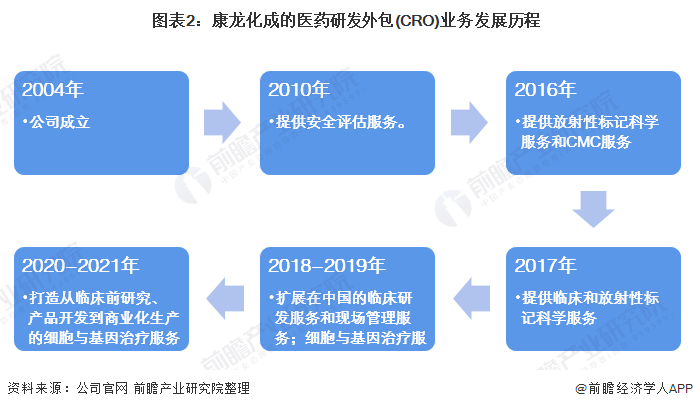 目前,我国医药研发外包(CRO)市场龙头企业分别为药明康德和康龙化成,两家企业CRO业务布局历程如下:
