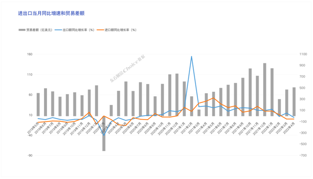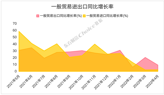 Choice数据统计显示,4月一般贸易进、出口同比增速分别由2022年1月的26.31%、30.96%下滑至2.49%、9.35%。