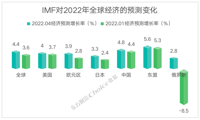 根据国际货币基金组织(IMF)4月19日发布的《世界经济展望报告》中对全球经济的预测数据可以看出,大部分国家2022年的经济增速预测均遭到了下调。其中,俄罗斯受战争影响,经济预测增速直接从2.8%骤降为-8.5%,全球整体经济增速也从4.4%降至3.6%。