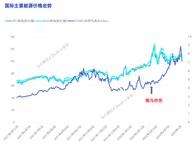 在对俄的制裁下,全球能源价格一路飙升,据Choice数据统计显示,俄乌冲突爆发后,WTI原油、Brent原油价格最高分别升至123.70美元/桶和127.98美元/桶,欧洲各国更是迎来了创纪录的高通胀。据欧盟统计局数据显示,欧元区国家4月份平均通胀率为7.5%,创下历史新高,能源类商品平均价格较去年同期上升38%。