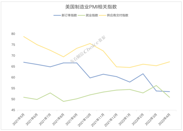 美国方面,4月美国制造业PMI指数为55.4%,环比下降1.7个百分点,为2020年7月以来的最低值。从供给端来看,由于地缘政治冲突,国际局势继续恶化,供应链及劳动力不足问题持续困扰着美国。PMI分项中,就业指数50.9%,较上月下滑5.4%,拉低制造业PMI指数1.08个百分点,虽然供应商交付指数有所上涨,但新出口订单小幅回落,供应链问题仍旧严峻。