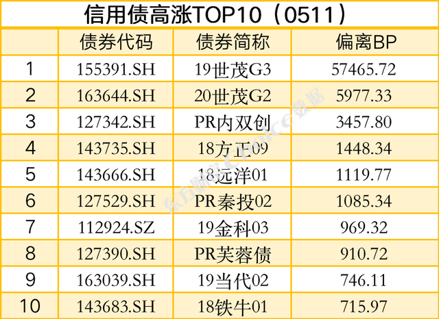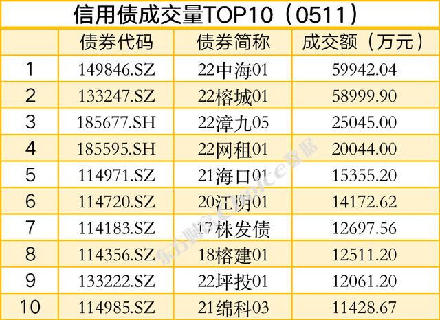 信用债方面,截至5月11日17:00,交易所成交量前三的债券为:22中海01、22榕城01、22漳九05;交易所涨幅前三的债券为:19世茂G3、20世茂G2、PR内双创。