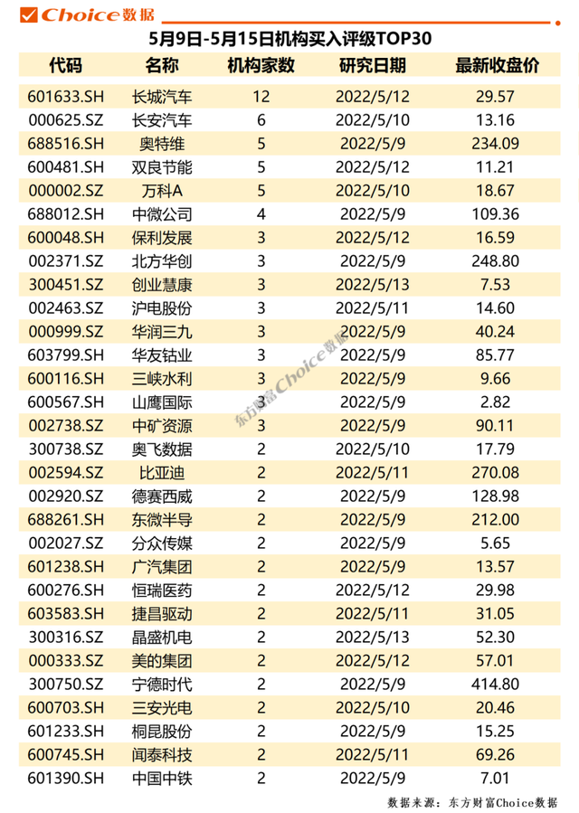长城汽车获得券商大力推荐,共12家机构给予了买入评级,排名第一;长安汽车位居其后,获得6家券商的买入评级推荐;上周汽车板块领涨,涨幅达8.41%。此外,奥特维、双良节能、万科A、中微公司也获得3家以上券商的买入推荐。