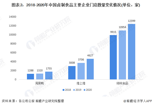 从门店数量看,2018年以来,我国卤制食品主要企业门店数量逐年增长,2020年,绝味食品门店数量(不含港澳台及海外市场)达12399家,远高于其他同类企业;煌上煌门店数量达4627家,周黑鸭门店数量达1755家。
