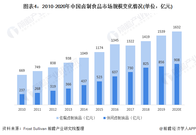 按产品定位和消费场景划分,卤制食品主要可分为佐餐卤制食品与休闲卤制食品两大派系。具体来看,2010年以来,佐餐卤制食品及休闲卤制食品市场规模均逐年增长,2020年,我国佐餐卤制食品市场规模约突破1600亿元。