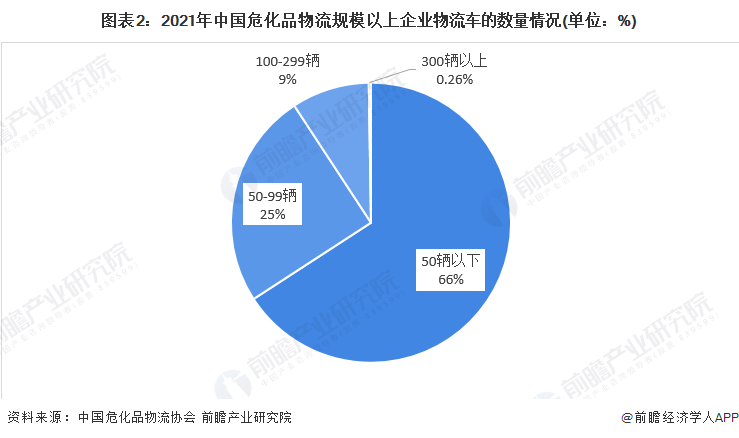 总体来看,我国危化品物流企业众多,且主要以中小企业为主。根据中国危化品物流协会统计的从规模以上企业布局的危化品物流车的数量规模来看,2021年,车辆在50辆以下的企业占比超过60%;车辆在300辆以上的企业仅有35家。整体来看,行业集中度较低,以中小型企业为主。