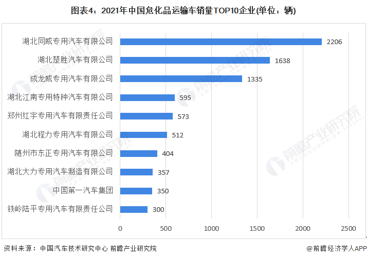 以危化品物流细分子行业危化品运输车企业的销量数据来看,2021年1-8月,全国共有78家企业实现销售,但仅有6家企业的销量超过了500辆。销量TOP10企业市场集中度为67.7%,较2020年同期提高了6.1个百分点,企业集中度进一步提升。其中湖北通威专用汽车有限公司以2206辆的销量排在首位,市场份额为18.1%。
