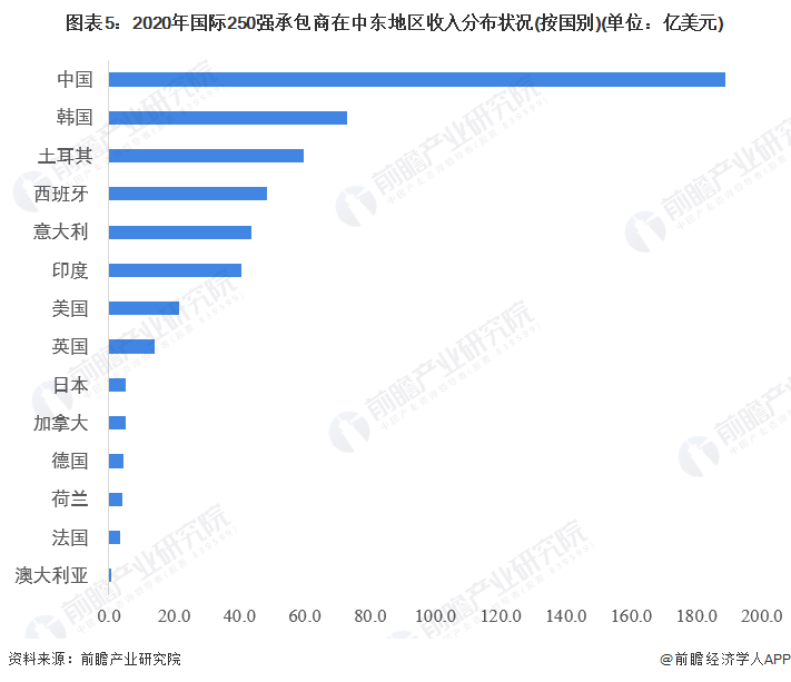 其中,2020年国际承包商250强在中东市场收入达到555.2亿美元,占比13.21%。