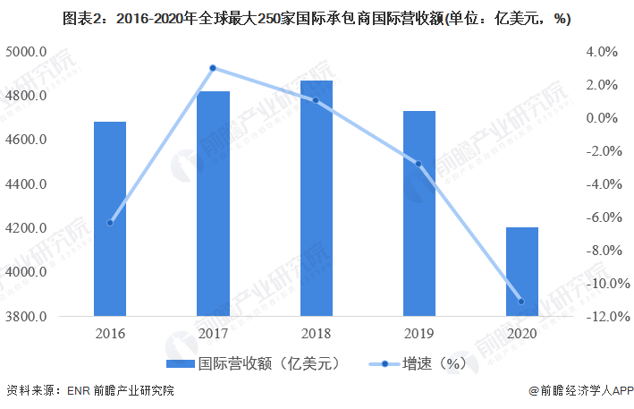 根据美国“工程新闻记录”(Engineering News Record,ENR)发表的统计数字,2016-2020年,全球最大250家国际承包商国际营收额呈先上升再下降的态势。2020年,主要受全球疫情影响,最大250家国际承包商国际营收额大幅下滑至4203.2亿美元,降幅达到了11.2%。