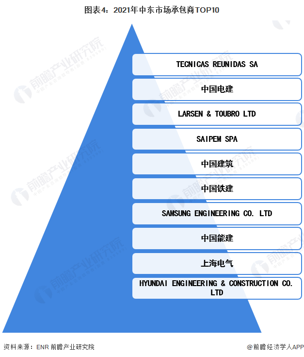 2021年,中东市场承包商中,TECNICAS REUNIDAS SA、中国电建、LARSEN & TOUBRO LTD分别位居前三位,前十位2020年国际营收额总计达到了212亿美元。