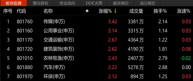 板块方面,传媒、公用事业、交通运输领涨;汽车板块盘中再度崛起,十余只概念股涨停,龙头中通客车连续9天涨停。