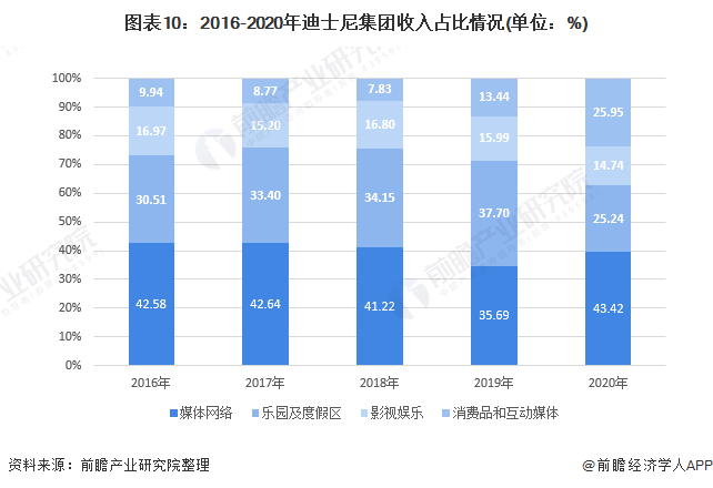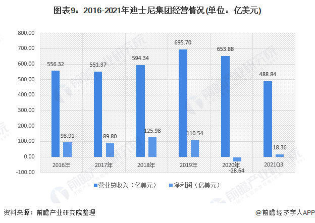 从迪士尼集团经营状况来看,2016-2019年主营业务收入不断增长,2019年达695.70亿美元为近年最高,2020年受疫情影响略有下滑,2020年迪士尼集团收入为653.88亿美元。整体来看,迪士尼集团经营情况较好。