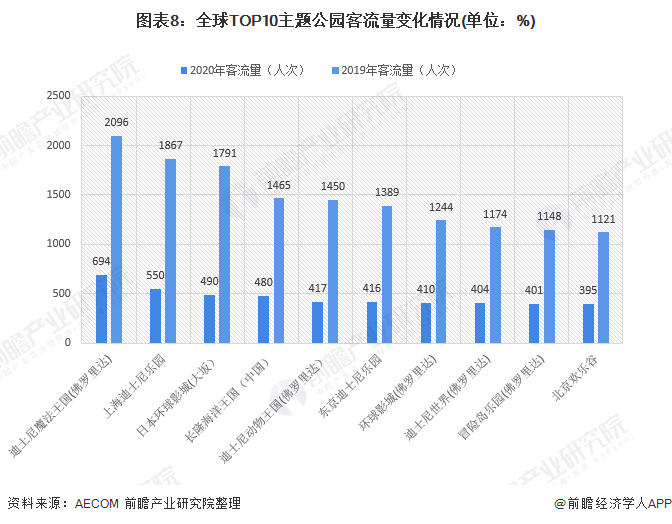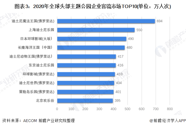 根据AECOM统计数据,2020年全球排名前10位(按照2020年客流量排序)的主题公园分别为:迪士尼魔法王国(佛罗里达)、上海迪士尼乐园、日本环球影城(大坂)、长隆海洋王国(中国)、迪士尼动物王国(佛罗里达)、东京迪士尼乐园、环球影城(佛罗里达)、迪士尼世界(佛罗里达)、冒险岛乐园(佛罗里达)、北京欢乐谷。其中有5家在美国地区、3家在中国。在全球TOP10主题公园中,迪士尼集团占半数。