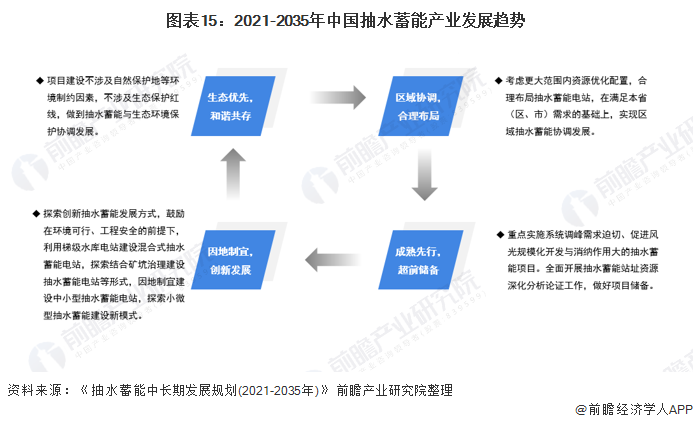 在发展趋势方面,参照《抽水蓄能中长期发展规划(2021-2035年)》,2021-2035年间,我国抽水蓄能项目建设将遵循:生态优先,和谐共存;区域协调,合理布局;成熟先行,超前储备;因地制宜,创新发展,这四大原则合理有序的发展: