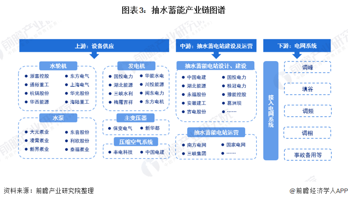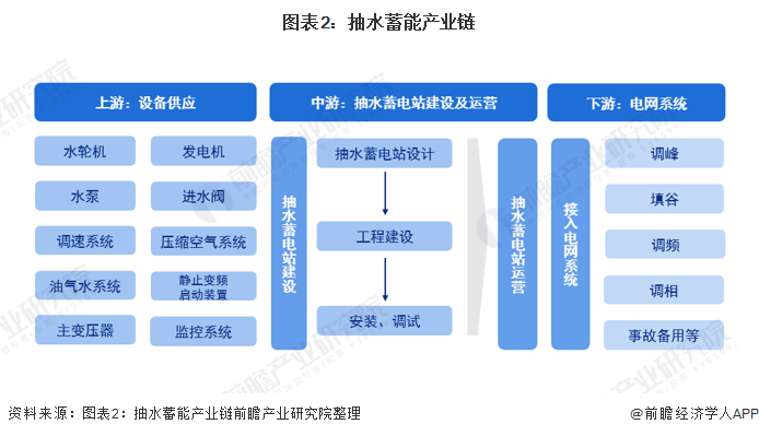 抽水蓄能产业的上游即抽水蓄能电站的设备供应方,主要设备包括水轮机、发电机、水泵、进水阀、压缩空气系统等;产业中游为抽水蓄能电站的设计、建设和运营;产业下游为抽水蓄能电站的应用,主要应用在电网系统,作为电网的调峰、填谷、调频、调相、事故备用等用途: