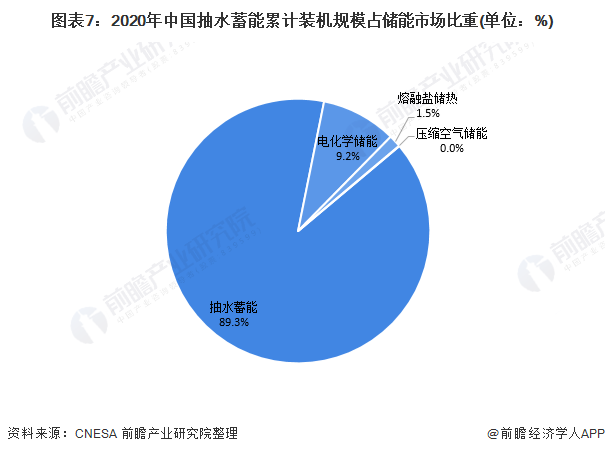 抽水蓄能作为储能行业的细分市场之一,由于技术发展早、经济性优,目前已成为储能市场中最大的细分市场。截至2020年末,抽水蓄能累计装机规模占储能市场比重达89.3%。