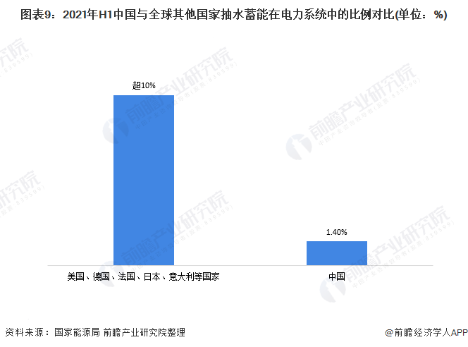 然而,从抽水蓄能在电力系统中的占比来看,美国、德国、法国、日本、意大利等国家发展较快,抽水蓄能和燃气电站在电力系统中的比例均超过10%,但我国仍处于较低水平,2021年上半年仅占1.4%,与发达国家相比仍有较大差距,不能有效满足电力系统安全稳定经济运行和新能源大规模快速发展需要。
