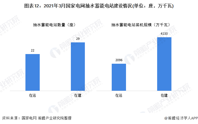 2021年3月,国家电网公司在运抽水蓄能电站数量为22座、装机规模为2096万千瓦,在建抽水蓄能电站数量约29座,装机规模为4133万千瓦