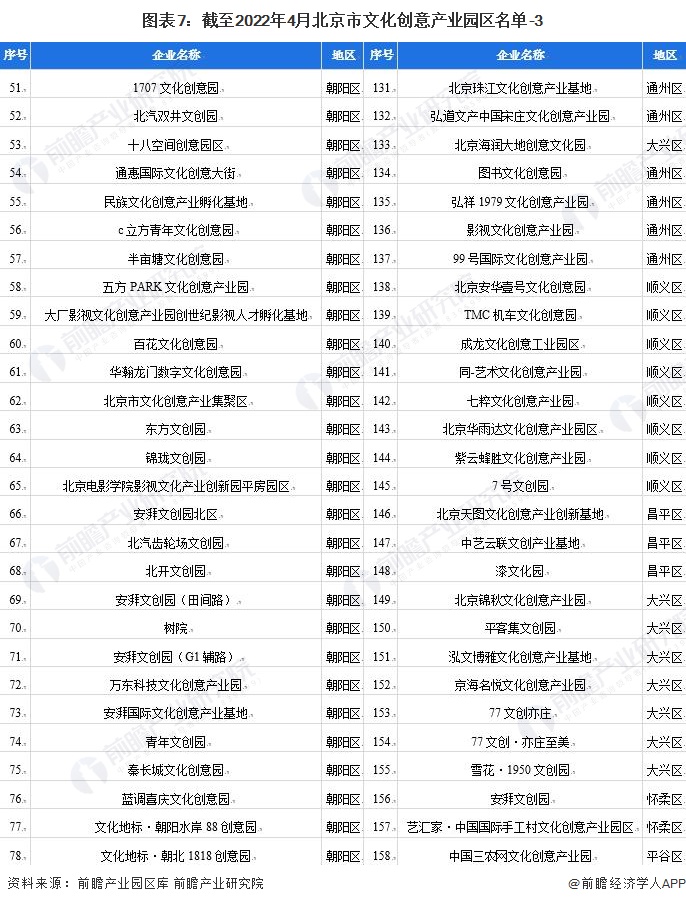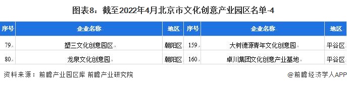 截至2022年4月,北京市文化创意产业园区的数量为160个,具体名单如下: