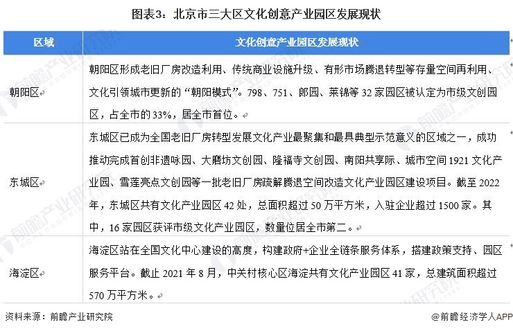 北京市朝阳区、东城区和海淀区市是文化创意产业园区发展的重要区域,其中朝阳区的文化创意产业园区规模占北京市总规模近三分之一,位列全市第一。