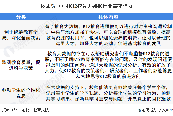 K12教育作为我国教育体系中最为基础的教育,其发展的好坏直接关系到我国教育事业的进程。目前K12教育存在着资源分配不均衡、城乡差距大等问题,也是目前我国教育改革的重点。而教育大数据能够对K12教育过程中所产生的所有数据进行深度分析和深度学习,国家能够有效利用这些数据对K12教育进行改革。具体需求潜力如下:
