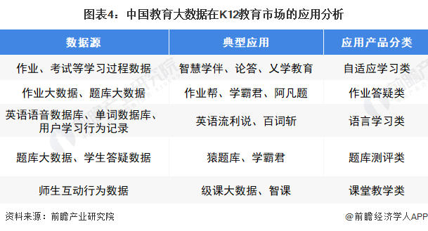 目前,我国教育大数据在K12教育阶段应用最为广泛的市场之一,其应用多为学校教学管理及教师对学生的管理。此外,K12教育阶段的教育大数据主要是将优秀教师的教学能力通过视频、线上教学、课件制作标准化等数字化后,得以复制和推广,同时实现课堂精准教学。