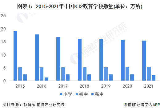 2015-2021年,我国小学教育学校数量逐年下滑,2021年为15.43万所;我国初中和高中教育学校数量呈现先下降后上升趋势,初中教育学校数量在2017年下滑至5.19万所后在2018年开始反弹,2021年为5.29万所;高中教学学校数量则波动变化,2021年为2.19万所。