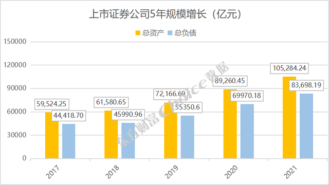 近年来,证券公司总体规模持续扩张。据Choice数据统计,41家上市券商的总资产规模从2017年的6万亿增长到2021年的10.5万亿,增长78%;总负债规模也从2017年的4.4万亿增长到2021年的8.4万亿,增长91%。证券公司规模的稳健增长为中国资本市场的发展提供了源源不断的优质服务。