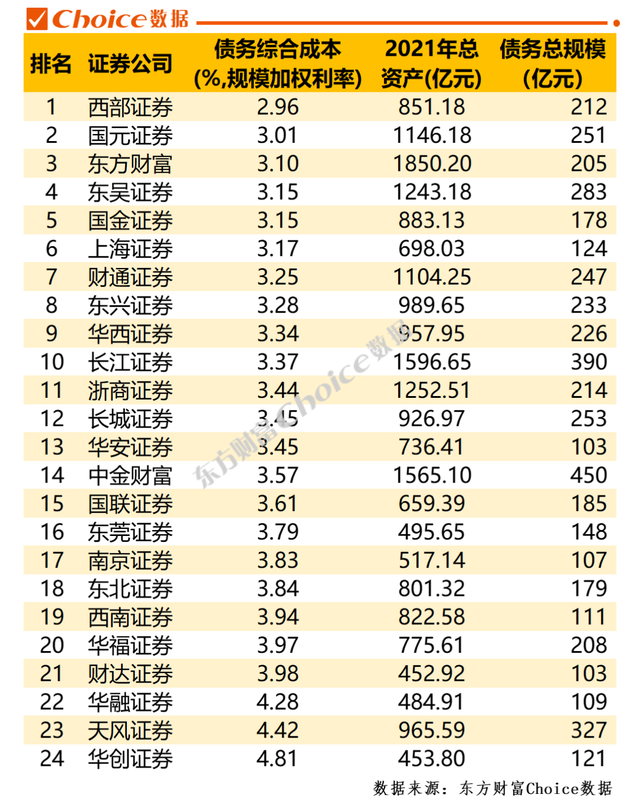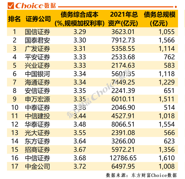 西部证券、国元证券、东方财富证券凭借较好的择时能力,在100亿到500亿的梯队中成功将综合融资成本控制在前三名。西部证券更是将综合成本控制到3%以内,成为全行业融资成本最低的券商。