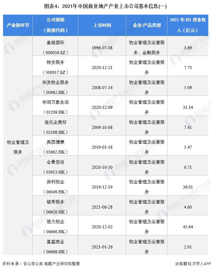 物业管理及服务上市公司:皇庭国际(000056.SZ)、特发服务(300917.SZ)、华发物业服务(00982.HK)、华润万象生活(01209.HK)、佳兆业美好(02168.HK)、奥园健康(03662.HK)、合景悠活(03913.HK)、保利物业(06049.HK)、越秀服务(06626.HK)、恒大物业(06666.HK)、星盛商业(06668.HK)、卓越商企服务(06989.HK);