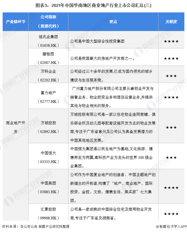 商业地产是我国商业体系的重要分支,也是房地产行业的重要组成部分。目前,我国华南地区商业地产产业的上市公司数量较多,分布在各产业链环节。具体包括: