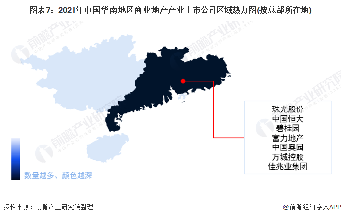 从华南地区商业地产的上市企业所在地来看(按总部所在地),基本所有的上市企业均处于广东省,这主要是由于广东省紧邻香港,在上世纪七八十年代,受益于改革开放,香港的房地产企业和企业家来到内陆发展,广东省则最为受益。