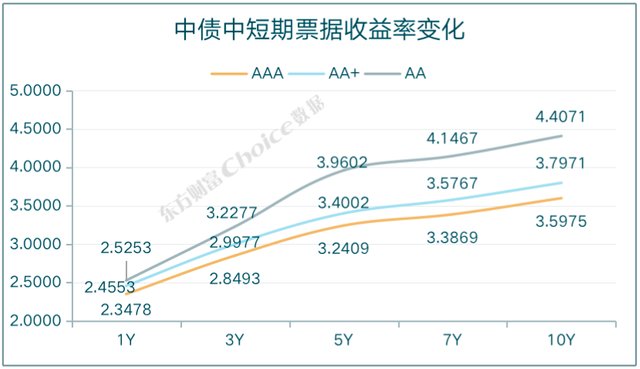 中债5年中短期票据(AAA)收益率报3.2409%,上行1.36BP;中债5年城投债(AAA)收益率报3.2480%,上行2.20BP。