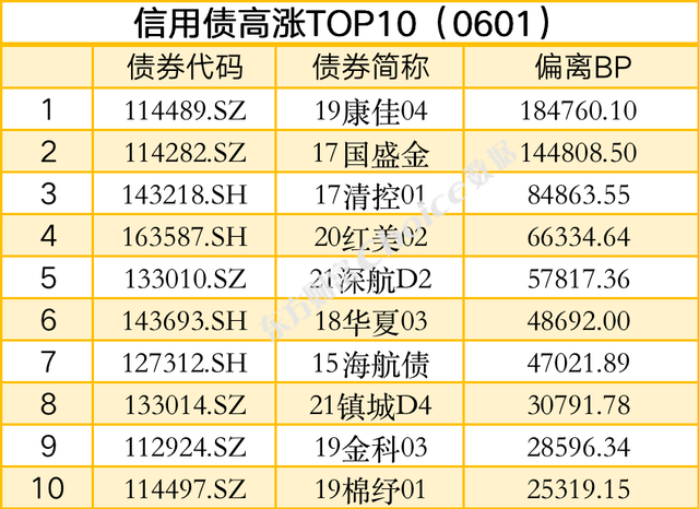 信用债方面,截至6月1日17:00,交易所成交量前三的债券为:21科城01、21SZMC06、21嘉城01;交易所涨幅前三的债券为:19康佳04、17国盛金、17清控01。