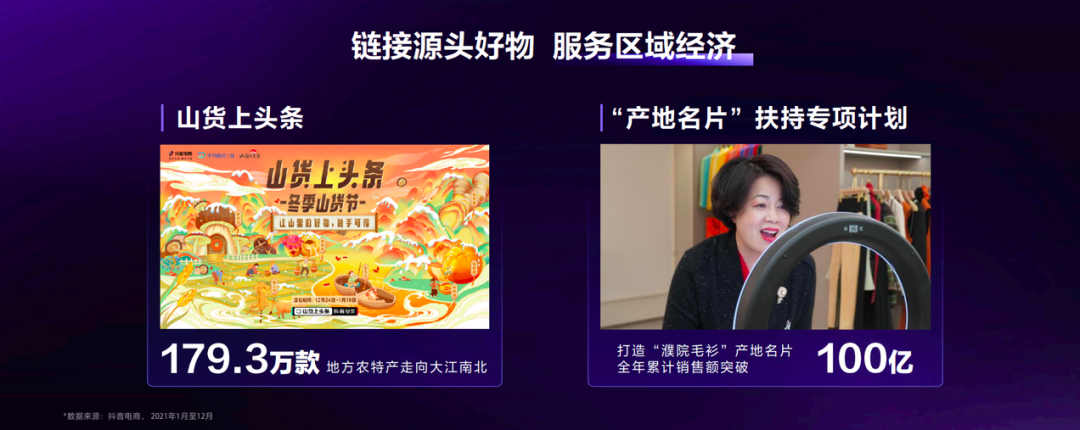 在助力乡村振兴和推动国货发展方面,抖音电商同样在发挥平台的力量。2021年,抖音电商联手字节跳动公益共同打造了“山货上头条”项目,让179.3万款地方农特产走向大江南北,延边辣白菜、陕西猕猴桃、连城地瓜干等成为爆款商品。