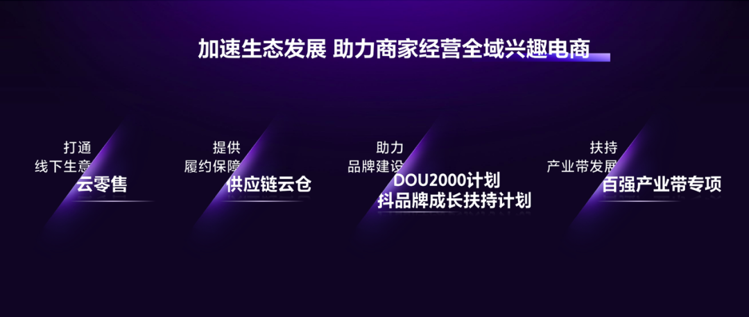 另外一方面,在抖音电商罗盘、抖店、抖音电商供应链云仓、商家服务体验等方面,为商家提供丰富的产品支持。