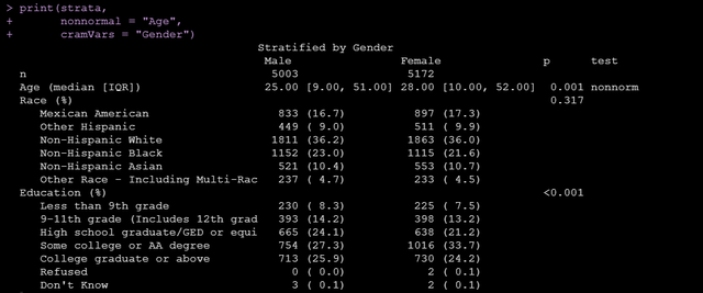 strata <- CreateTableOne(data = data, vars = c("Age", "Race", "Education"), factorVars = c("Race","Education"), strata = "Gender")print(strata, nonnormal = "Age", cramVars = "Gender")上面的代码中,strata参数设置分组变量,factorVars指定变量类型为因子,vars参数指定我们要进行统计描述的变量,运行后出来的结果如下: