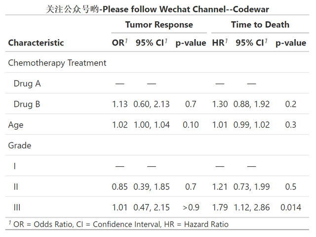 tbl_merge_ex1 <- tbl_merge( tbls = list(t1, t2), tab_spanner = c("**Tumor Response**", "**Time to Death**") ) %>% modify_caption("**关注公众号哟-Please follow Wechat Channel--Codewar**")运行后输出结果如下: